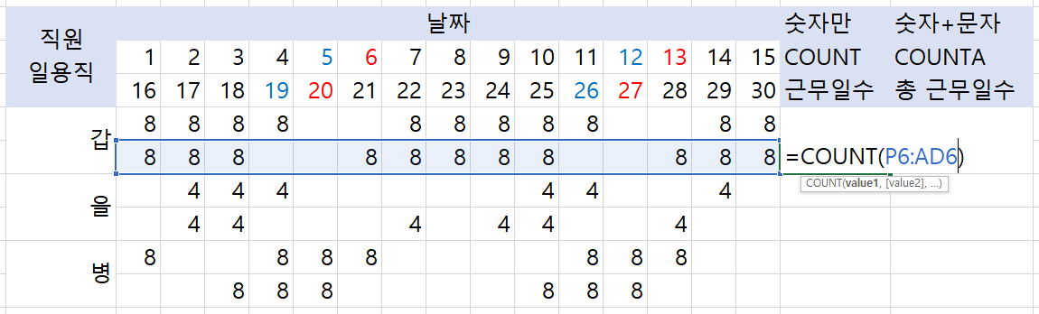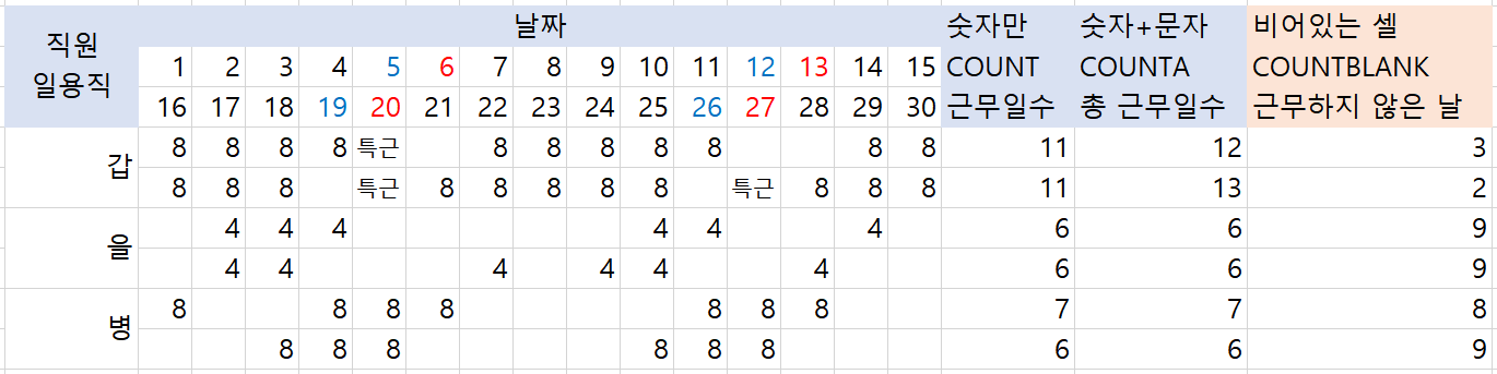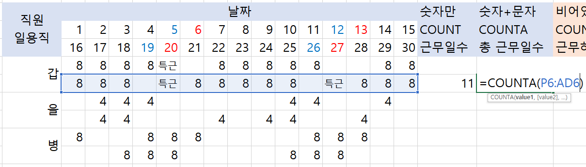 위와 같이 근무한 날에 근무시간 숫자만 적혀있으면 좋겠죠?