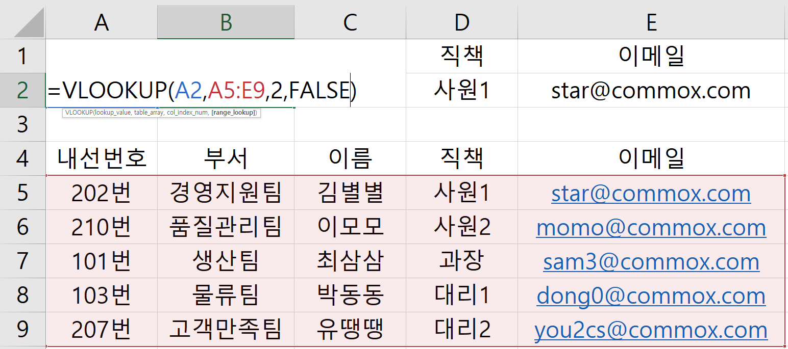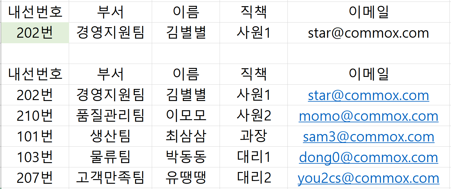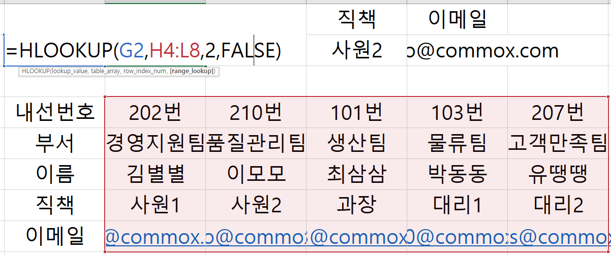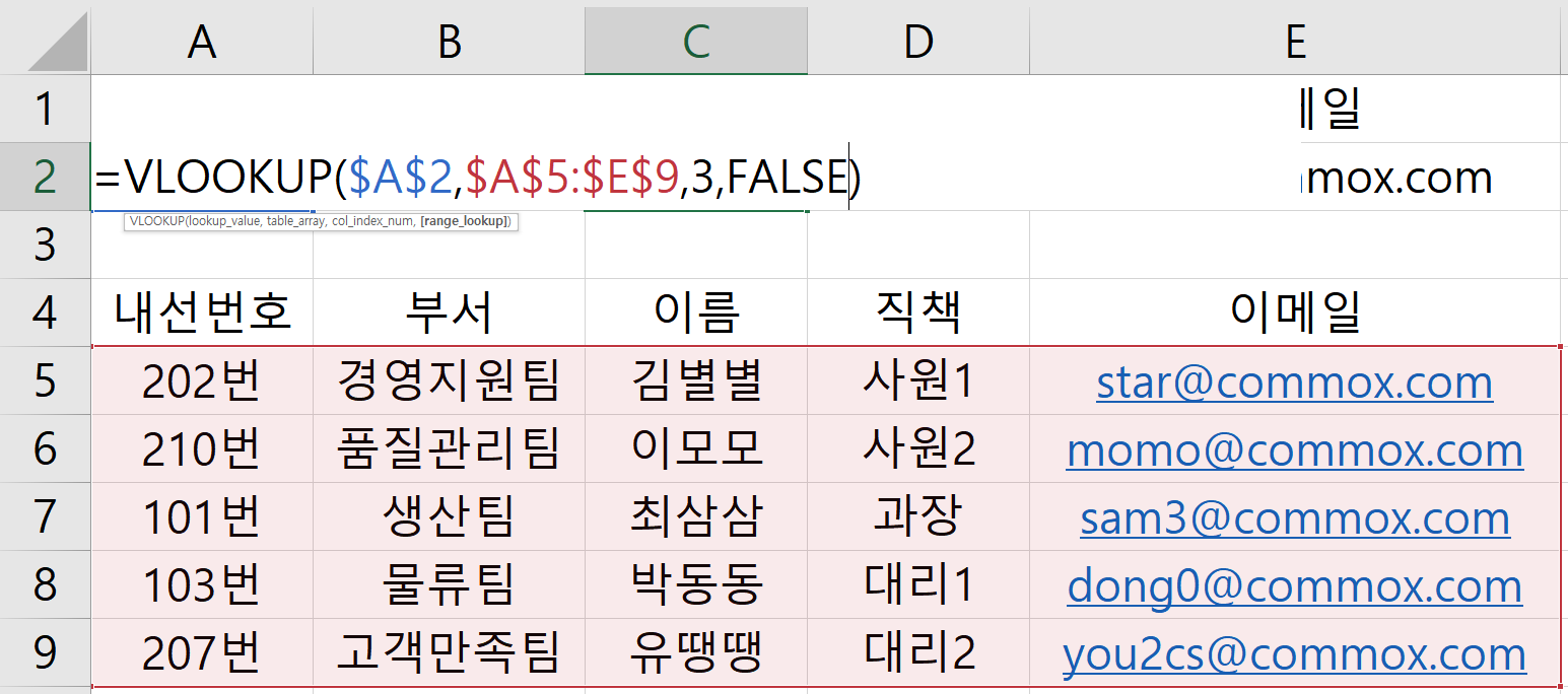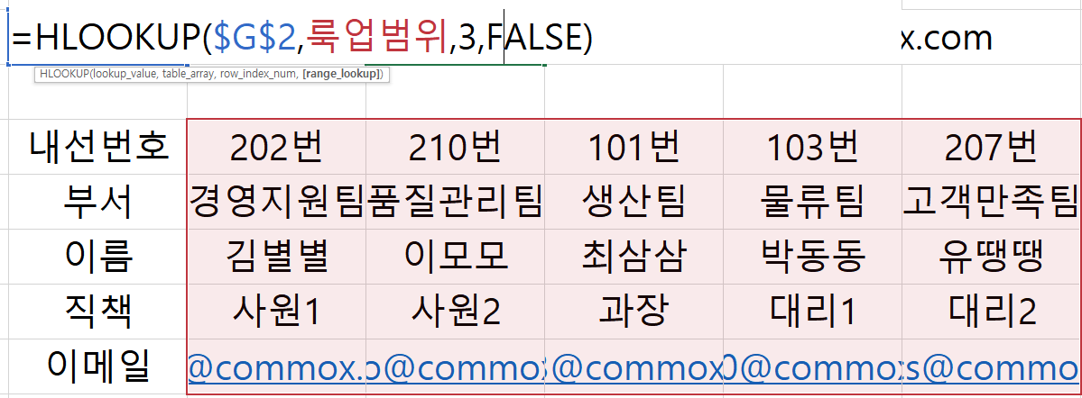 내선번호는 수기로 입력하고 그에 따른 부서, 이름, 직책, 이메일은 자동으로 값이 불러지게끔 VLOOKUP 함수를 사용하였다.