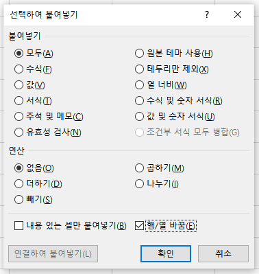 참고로 나는 포스팅하기 위하여 선택하여 붙여넣기-행/열 바꿈을 사용하였다.
