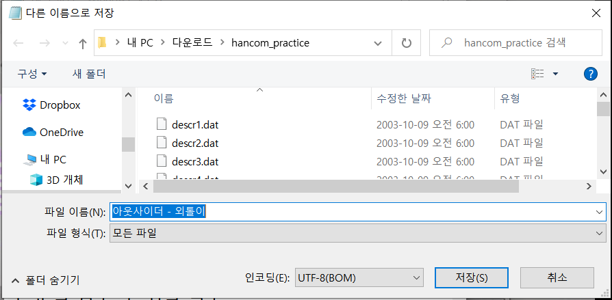 구버전은 위 방법과 같이 모든 파일, UTF-8(BOM)으로 설정했는데 오류가 났다.