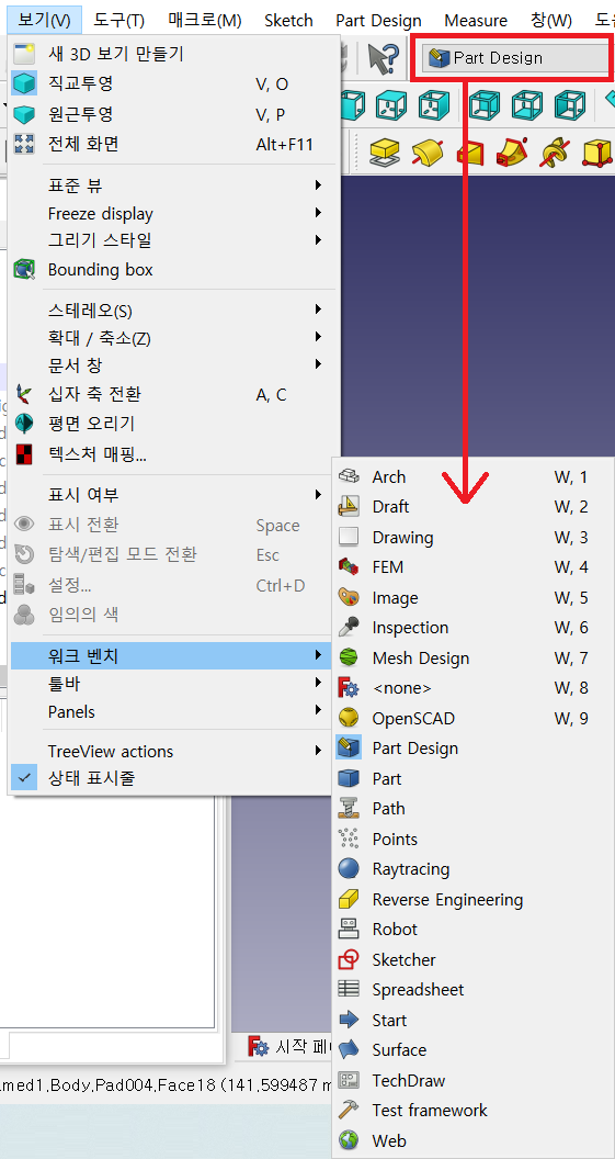 2) 프리캐드 FreeCAD 위쪽 메뉴 위 아이콘 설명 work bench