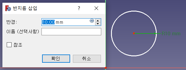 원의 중심은 클릭이 안되고 원만 클릭이 된다. 원 치수 넣기 도구를 클릭 후 원에 마우스 커서를 갖다 대면 하얀 선에서 노란 선으로 바뀐다. 반지름 제약조건 창이 뜨면 반경을 입력하면 된다. 나는 10을 입력하고 확인을 눌렀다.