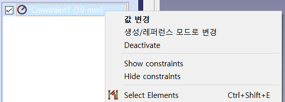 왼쪽 콤보 보기 창의 작업에서 Constraints를 보면 원 모양 그림과 함께 치수 mm가 있을 것이다. 클릭 후 마우스 오른쪽 클릭을 하면 값 변경이 뜬다. 원을 선택하면 오른쪽 반지름을 나타내는 치수 선이 빨간색에서 초록색으로 바뀌니 혹시 여러 원이 있으면 색깔 달라지는 것으로 보고 내가 무엇을 선택했는지 알 수 있다.