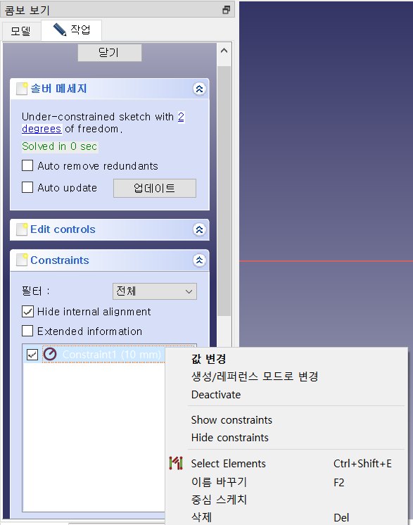 치수는 도형의 제약 조건 Constraint에서 볼 수 있다. 치수는 콤보 보기의 작업-Constraint에서 삭제하면 된다.